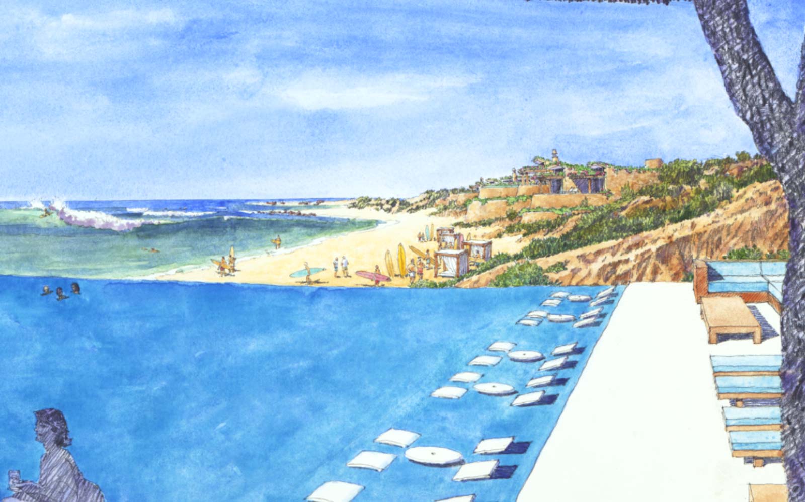 Emerging from the natural undulations of the earth, and taking advantage of the sweeping views looking down the arroyos, the Beach Club forms the centerpiece of the community—visually, spiritually and socially. Poised down on the beach flanked by residential villas and alluring sands, this rustic resort environment caters to the pursuit of