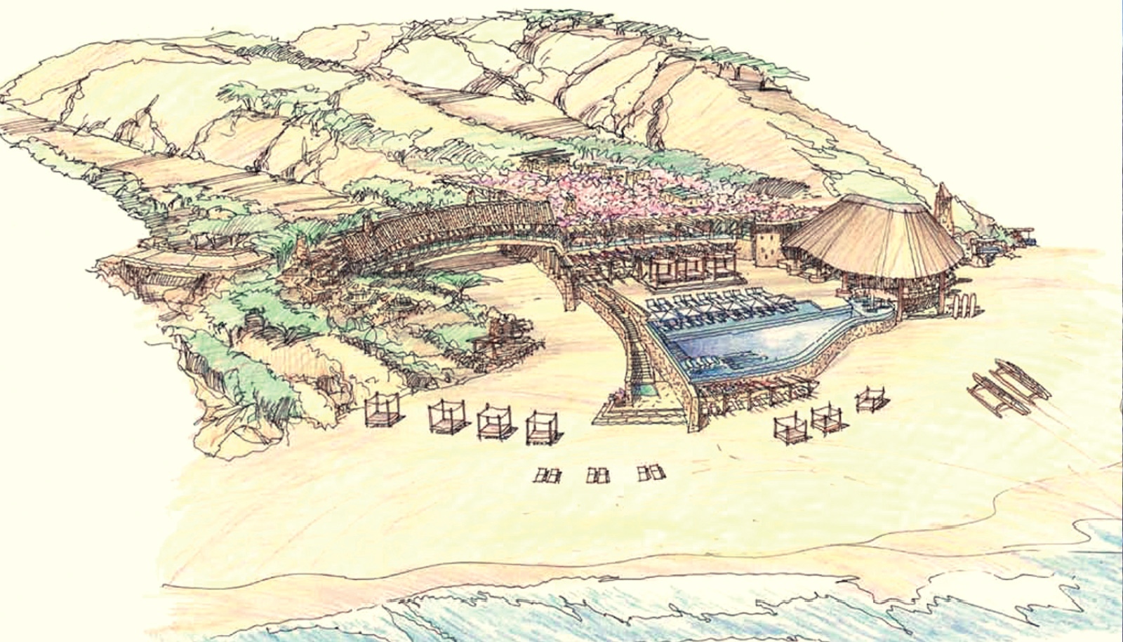 Emerging from the natural undulations of the earth, and taking advantage of the sweeping views looking down the arroyos, the Beach Club forms the centerpiece of the community—visually, spiritually and socially. Poised down on the beach flanked by residential villas and alluring sands, this rustic resort environment caters to the pursuit of
